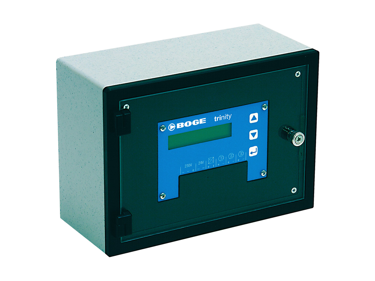 Med Airtelligence trinity kan du styra upp till tre kompressorer i nätverket, oavsett vilken storlek de har. Baslastväxlingen kan ställas in cykliskt och därigenom utnyttja alla kompressorer jämnt. Detta minskar underhållskostnaderna och din tryckluftsförsörjning fungerar mer ekonomiskt. LCD-displayen visar tydligt driftsförhållandena och parametrarna.